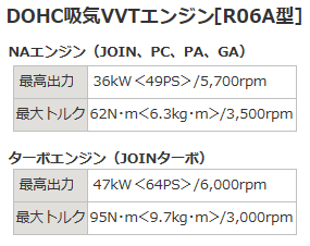 | 力強さと低燃費を両立する吸気VVT(可変バルブタイミ ング)採用のR06A型エンジン。太い低中速トルクが、荷 物積載時にもスムーズな走行性能を実現します。 JOINターボは、高速道路でも一段とゆとりある走りで長 距離の移動をささえます。 |