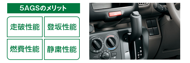 | 5MTをベースにクラッチおよびシフト操作を自動で行う新トランスミッションです。力強い走りに加え、電子制御によって優れた燃費性能を発揮。高速走行時はエンジン回転数を低く抑えることができるので高い静粛性を実現。また、AT同様のクリープ機能により、渋滞時の走行や車庫入れもスムーズです。積極的に加減速したいときはマニュアルモードを選択し、メーター内に表示されるギヤ段を確認しながらスムーズにシフト操作ができます。 |